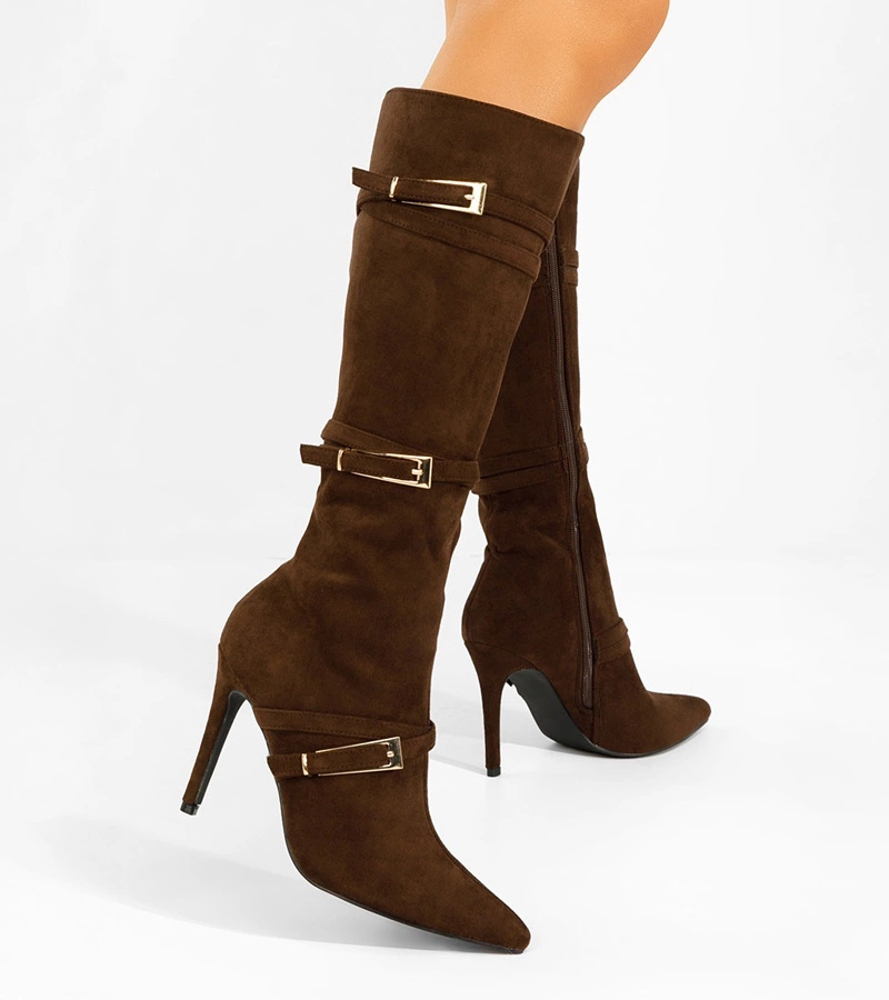 Csokoládé színű tűsarkú csizmák díszes csatokkal Sadie