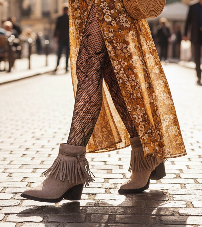 Sötétbézs rojtos oszlop sarkú bokacsizma Mulan