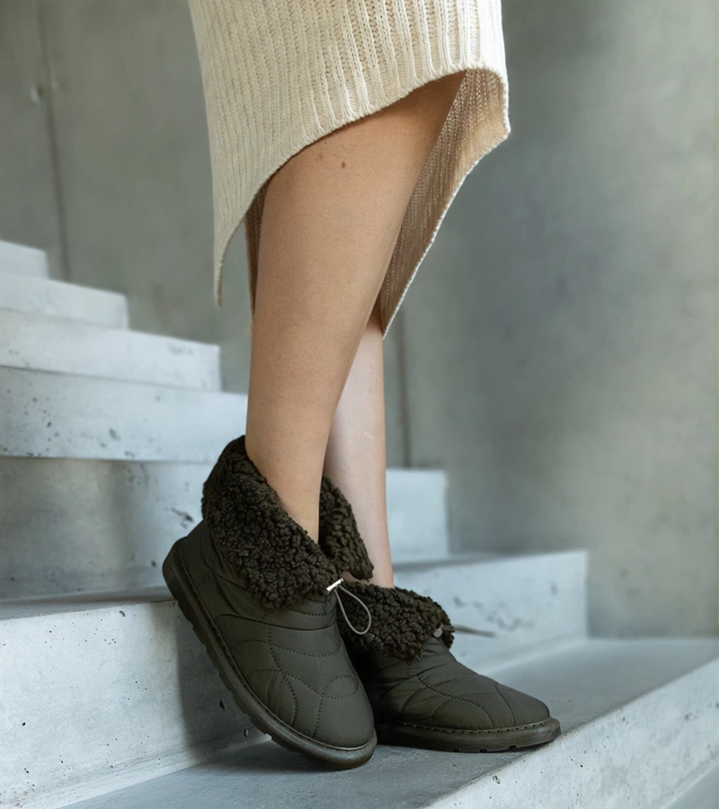 Zöld bélelt hócipő Caellita húzózsinórral.