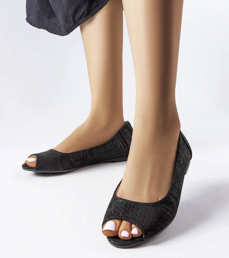 Fekete csillogó díszítéssel rendelkező balerinacipő, mint én magam