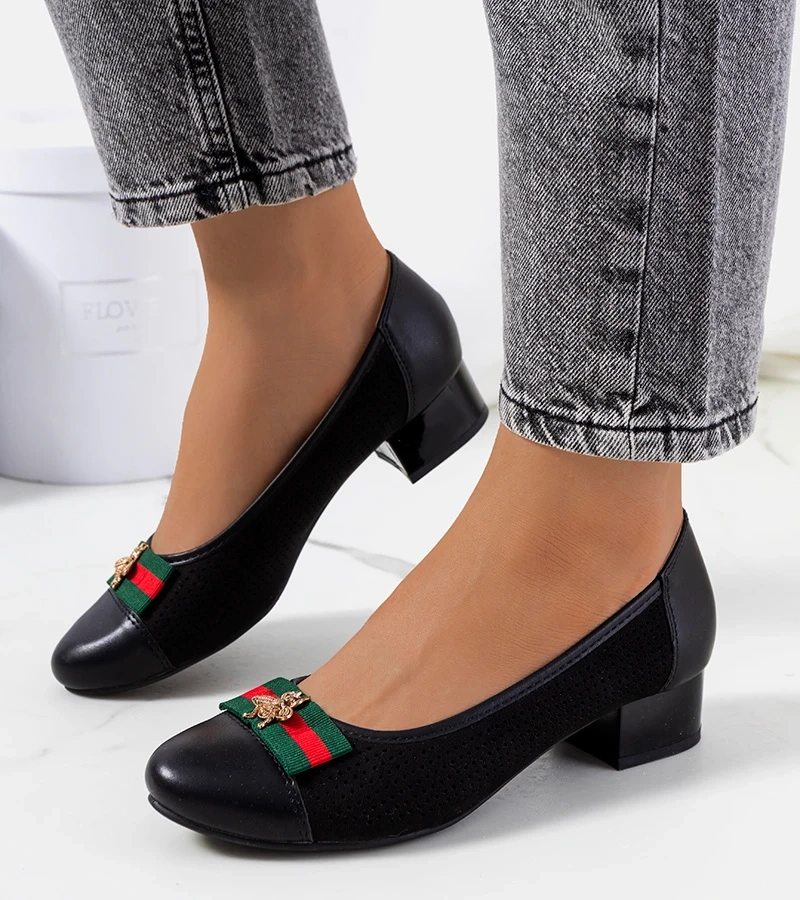 Alacsony sarkú fekete cipő arany díszítéssel Kessadi