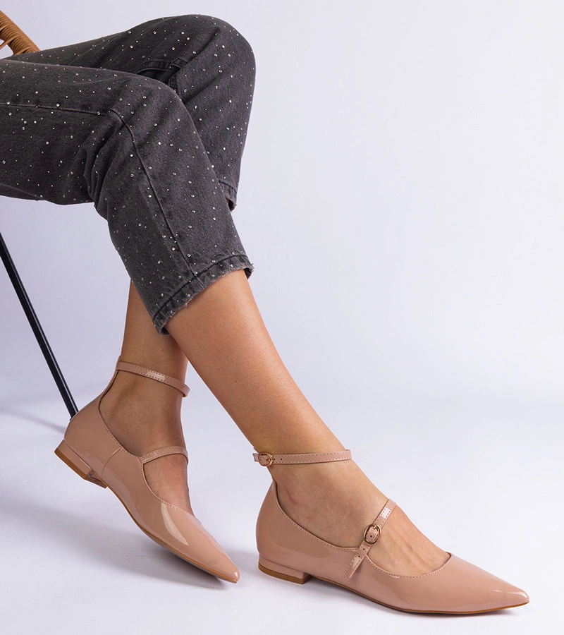Bézs lakkozott alacsony sarkú cipő csatokkal Ewerida
