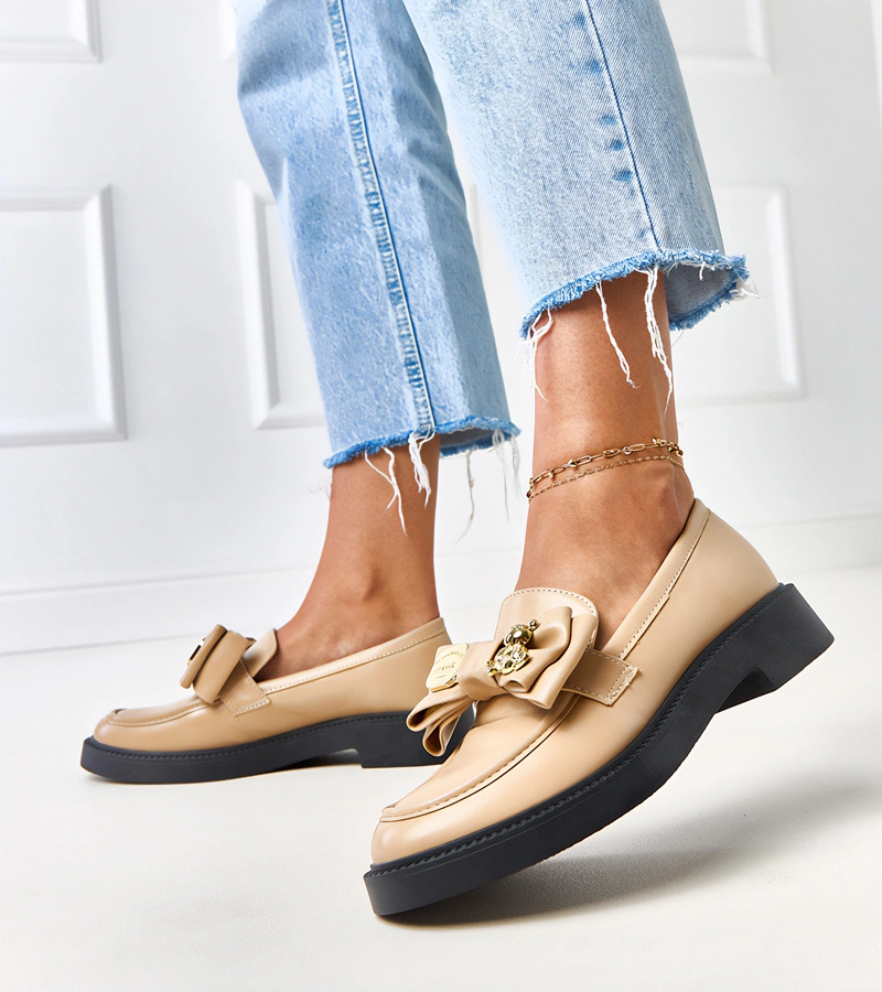 Barna mokaszinok masnival és arany medvével díszítve Nensi