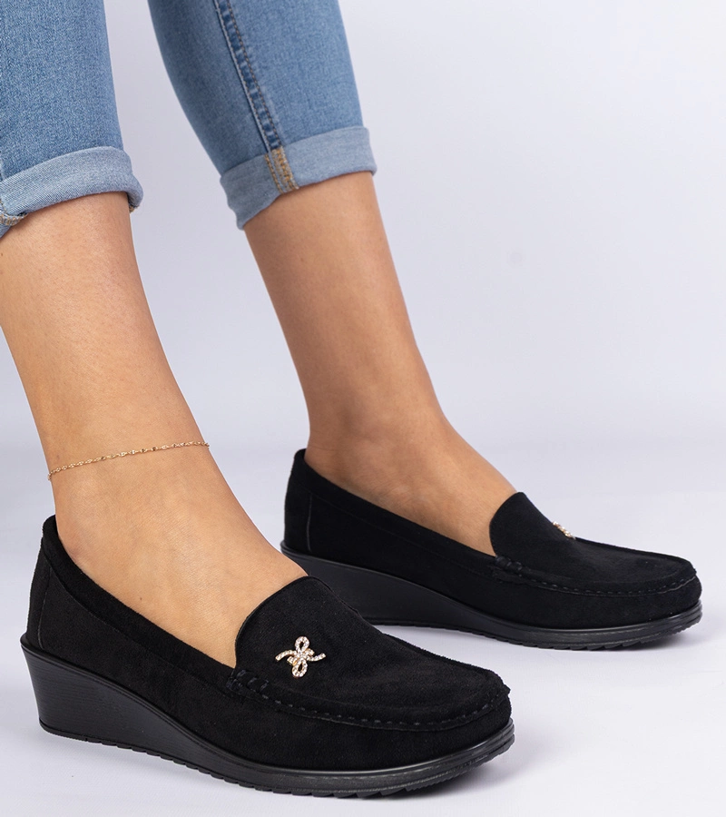 Sarimi női fekete mokaszin ék sarkú öko velúr