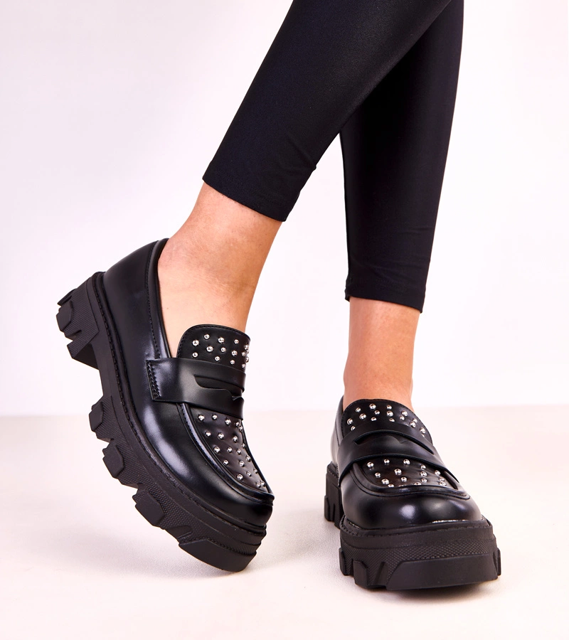 Fekete női mokaszin vastag talppal bőrből, strasszkövekkel díszítve Linsol