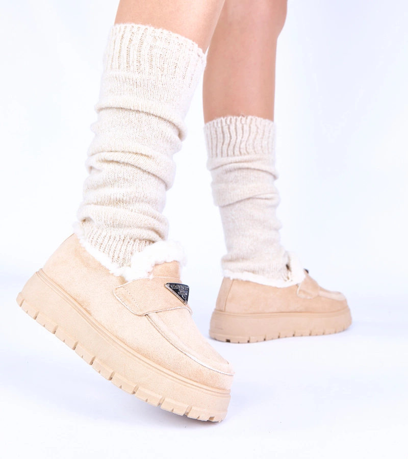 Világos bézs, prémmel bélelt, platformos Kirby mokaszin