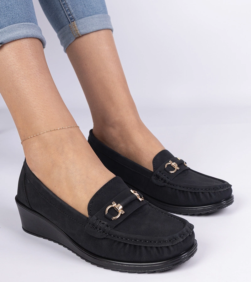 Fekete lyukacsos öko-velúr mokaszin arany díszítéssel Truffi