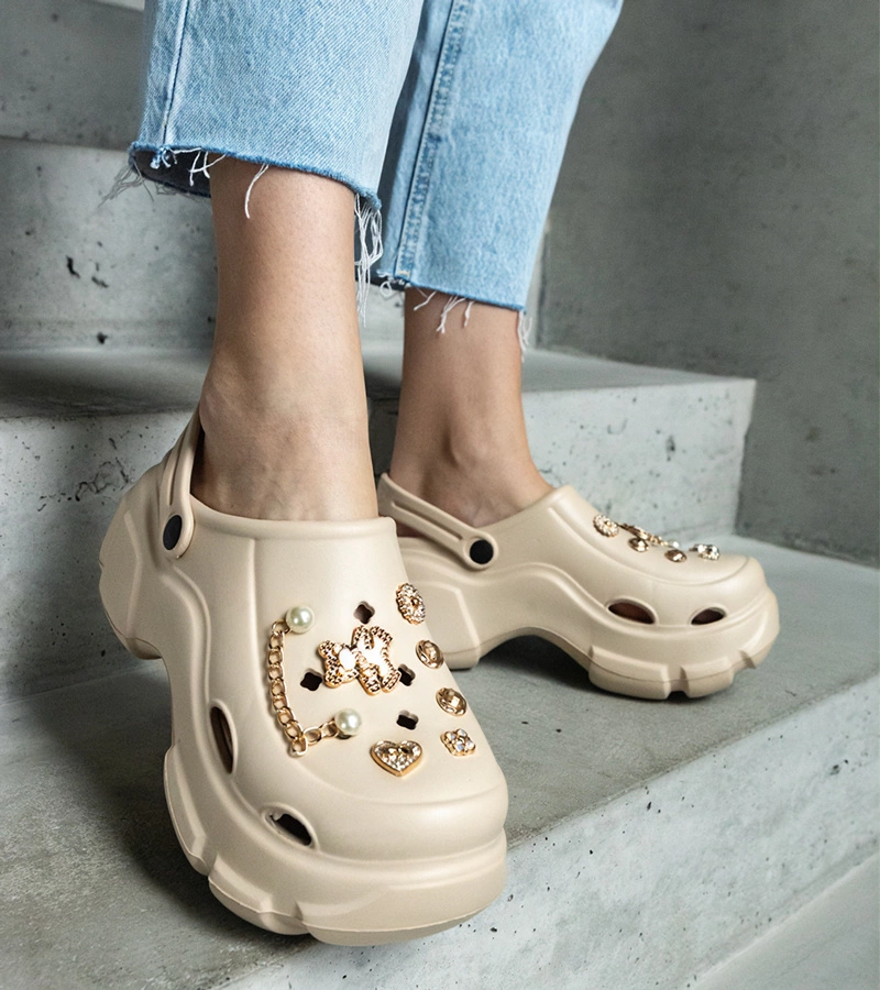 Sötétbézs zárt platform papucs Aria kitűzőkkel díszítve