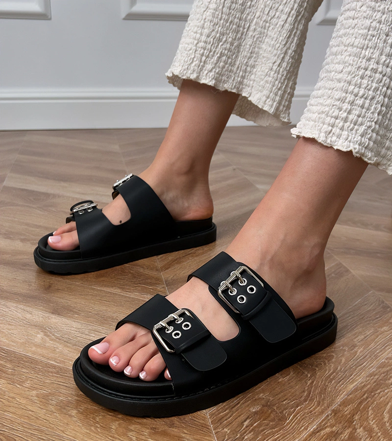 Fekete lapos papucs csatokkal a pántokon Liluna