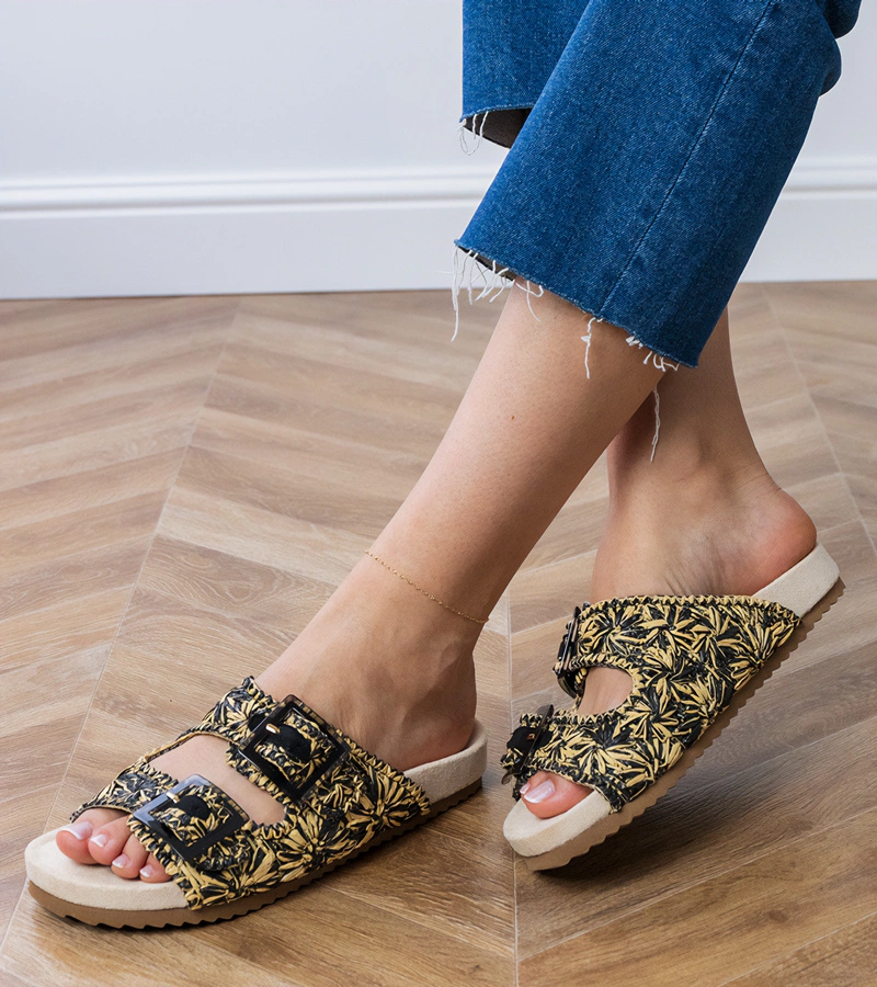 Fekete papucs csatokkal és hímzéssel a pántokon Kim