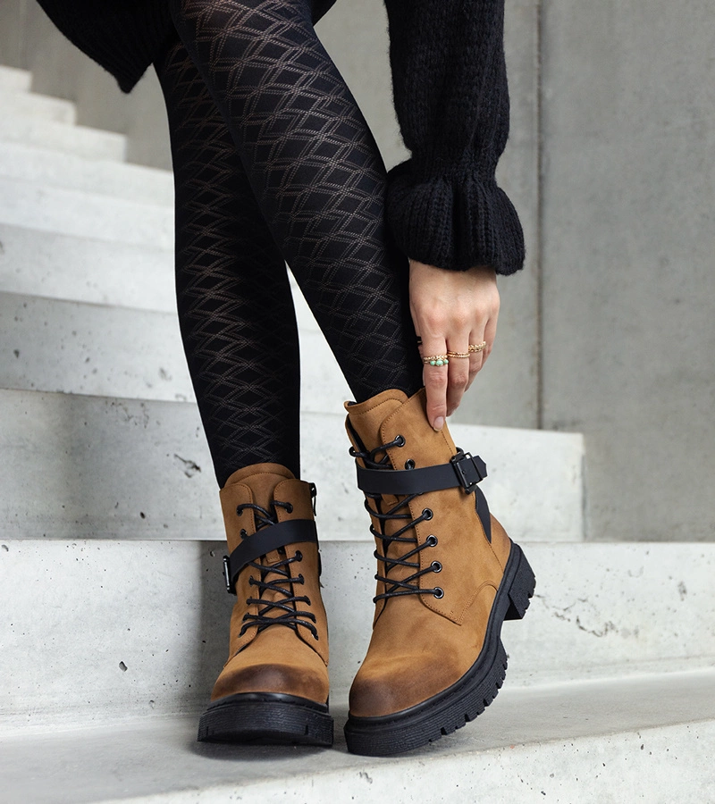 Barna, bélelt traper csizma kopásokkal és Kneesa pánttal.