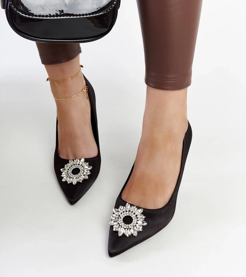 Susegana cirkóniával díszített, szatén bevonatú fekete tűsarkúak