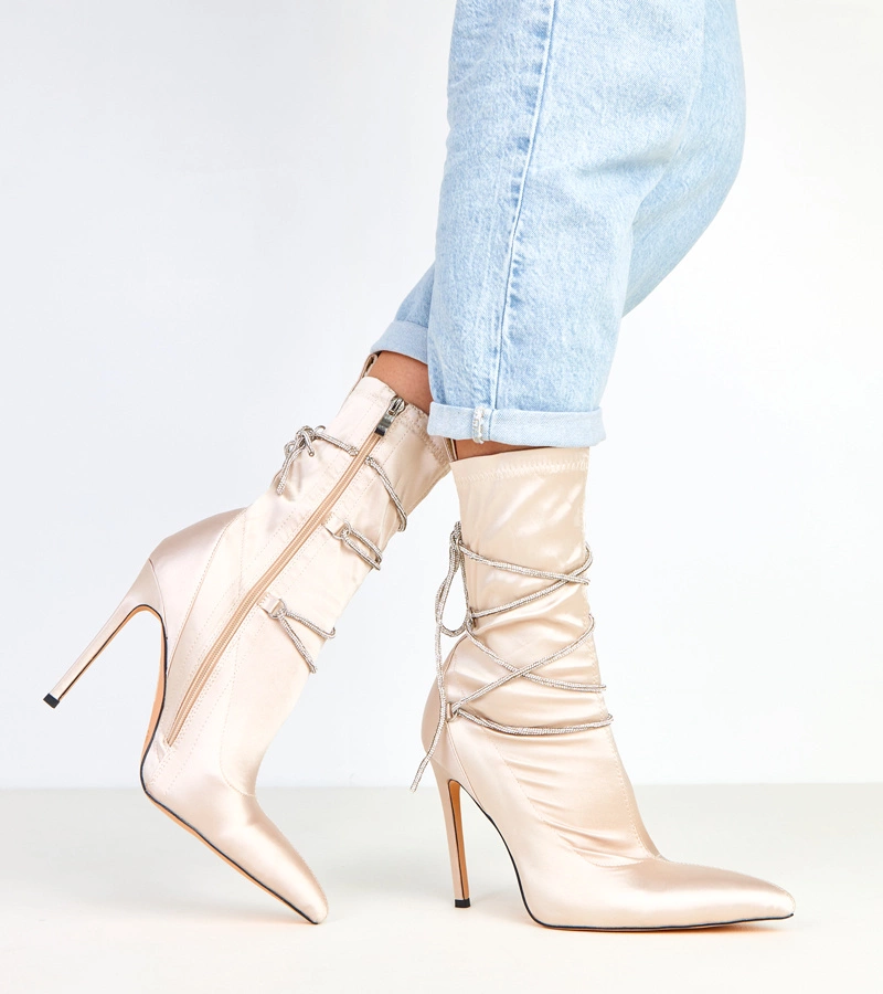 Tolnai pezsgő szatén tűsarkú bokacsizma strasszkövekkel