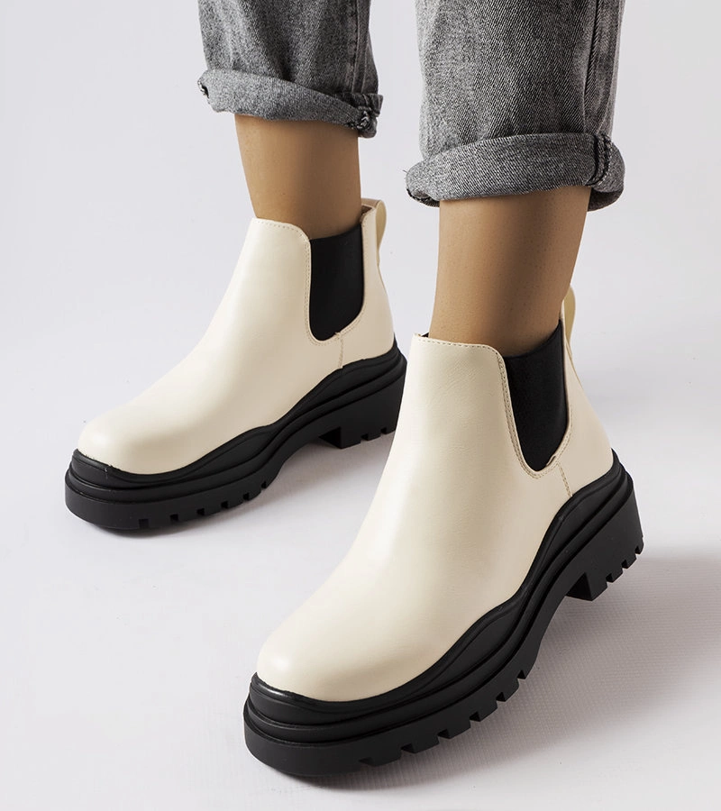 Abelina szimmetrikus sarokkal díszített bézs bokacsizma
