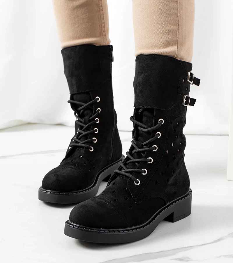 Fekete lapos bokacsizma kivágással és csattal Savaner