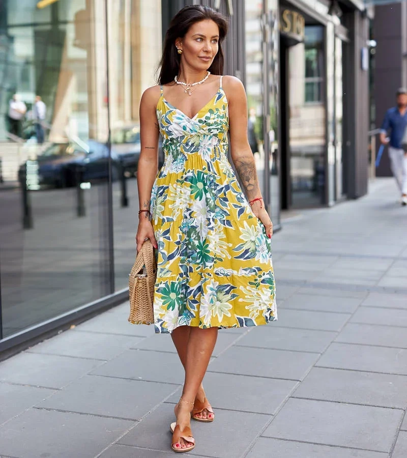 Fekete, színes virágokkal díszített Laccio pántos ruha