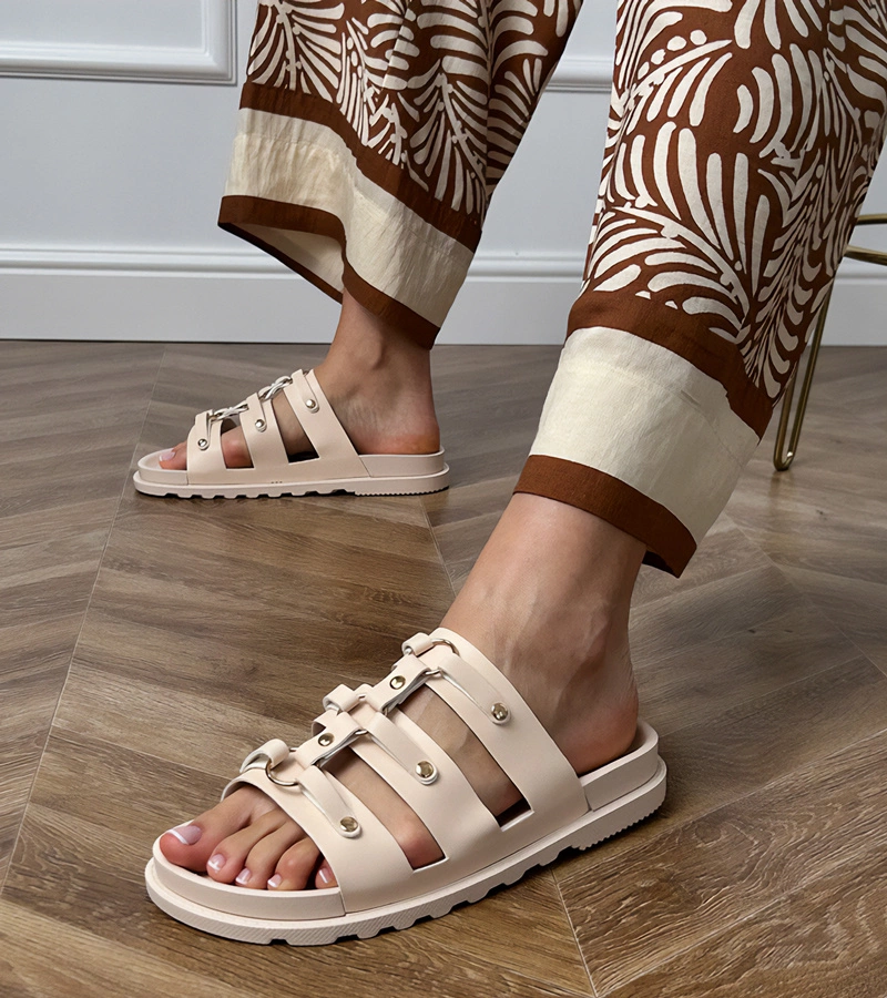 Bézs papucs pántokkal és cirkóniákkal a csatokon Lalis