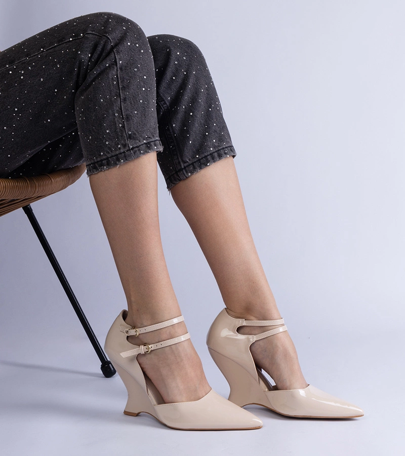 Bézs lakkozott alacsony sarkú cipő csatokkal Ewerida