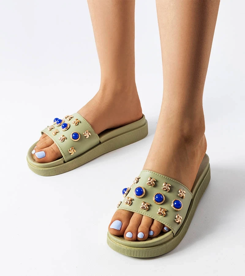 Ernesta ráncolt díszítéssel díszített bézs papucsok